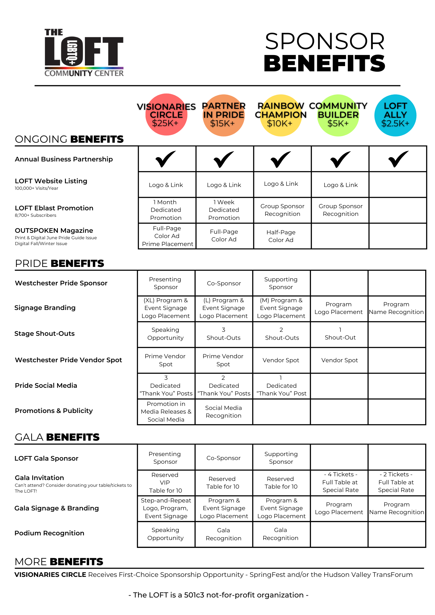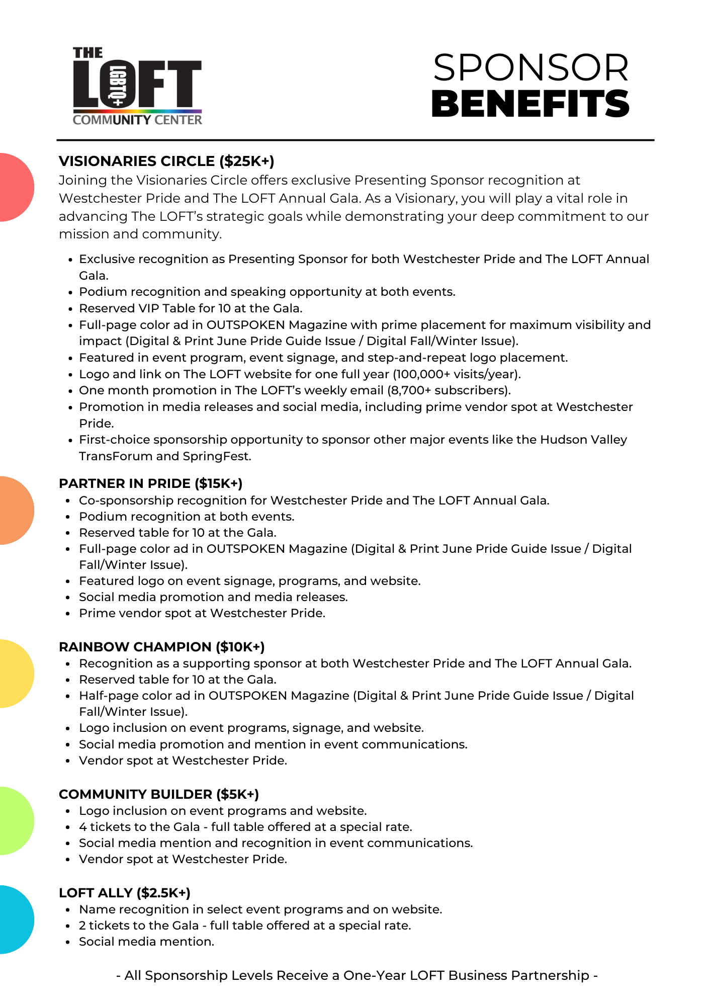 Support The LOFT and gain year-round visibility by becoming a sponsor! Our sponsorship packages offer incredible opportunities to connect with our vibrant LGBTQ+ community through premier events like Westchester Pride and The LOFT Annual Gala, as well as media exposure via OUTSPOKEN Magazine and digital platforms.